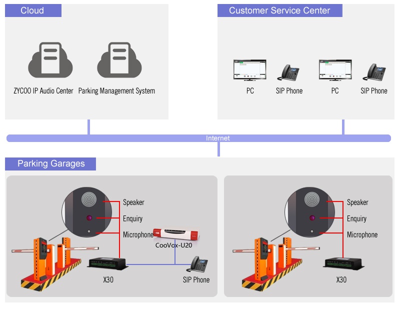 The ZYCOO IP Audio Center can be deployed in the cloud or on a bare metal server, and it will be integrated with parking management system. The service agents will be working in a remote customer service office instead of working on site. Each of the agent can manage one or more parking garages by working this way.